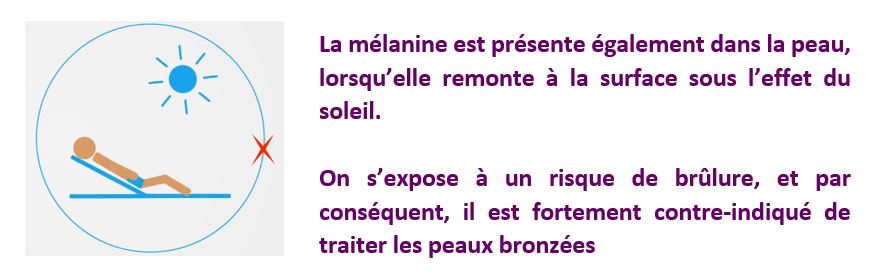 Le bronzage est à proscrire absolument car la mélanine de la peau absorberait le rayon du laser et la peau risquerait d’être brulée.