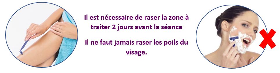 Il est nécessaire de couper les poils sur la zone à traiter avant la séance pour que l'émergence des poils soit visible. Les poils ne doivent pas être trop longs : le laser serait alors moins efficace.